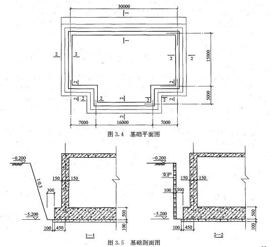 土建工程 某建筑物地下室挖土方工程,内容包括:挖基础土方和基础土方回填,基础土方回填 采用打穷机夯实,除基础回填所需土方外,余土全部用自卸汽车外运800m至弃土场。提 供的施工场地,已按设计室外地坪一0.20m平整,土质为三类土,采取施工排水措施。根据图3. 4基础平面图、图3. 5剖面图所示的以及现场环境条件和施工经验,确定土方开挖方案为:基坑1一1剖面边坡按1 :0.3放坡开挖外,其余边坡均采用坑壁支护垂直开 挖,采用挖掘机开挖基坑。假设施工坡道等附加挖土忽略不计,已知垫层底面积 586. 21m2。