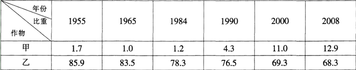 读我国甲、乙两类作物在我国种植面积比重变化表(单位:%)