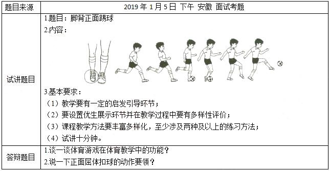 二、考题解析【教学过程】(一)开始部分1.课堂常规:体委整队,报告人数,师生问好,教师简要介绍教学内容,检查服装,安排见习生。2.导入:同学们,当今足坛当中大家熟知的足球明星都有哪些呢?嗯,这位同学说他知道“C罗”。哦,那位同学说他是梅西的粉丝。看来大家对于足球相关知识都很有兴趣啊,C罗和梅西是当今世界足坛的“绝代双骄”,他们在足球场上强大的进攻能力让我们叹为观止,他们这么好的球技也是通过一点一滴的训练慢慢形成的,在他们的成长之路上,脚背正面踢球是一项重要基本技术,今天同学们想不想学习该项技术呢,嗯,大家都想学习啊,好的,同学们,今天“足球小明星”训练班就此开班,要想成为“足球小明星”,我们就要认真训练起来了!2.队列队形练习:原地三面转法练习组织教学:四列横队。要求:队列整齐,步伐一致。(二)准备部分1.运球慢跑游戏—“运球小能手”。组织教学:学生每人脚下持1球,四排横队向右转,一排带球跑,二、三、四排紧随其后,老师在队伍旁侧进行提醒,在运球慢跑环节过程中绕过相关障碍物,完成整个运球慢跑环节,最后慢跑结束时鼓励全体图形跑过程中的团结协作意志品质,运球慢跑过程中教师要强调注意安全。2.口令健美操健美操基本步法练习。组织教学:四列横队体操队形,教师边做示范,边提示动作要领,语言激励学生,及时表扬鼓励。要求:节拍准确,动作到位,节奏感强。3.专项练习球性球感练习。组织教学:成体操队形散开。(三)基本部分1.示范正面示范和侧面示范相结合提问:老师的助跑路线、支撑脚的位置、击球部位都是怎么样的呢?回答:直线助跑,支撑脚在球侧方,击球的后中部。2.讲解直线助跑,最后一步稍大,支撑脚积极的以脚跟着地,踏在球的后侧方10~15厘米处,膝关节微曲,足尖正对出球方向;摆动腿以膝关节为轴,大腿带动小腿屈膝积极向前摆动,当膝关节摆置接近球的垂直方上方时,小腿做爆发式的前摆,使膝关节处在球的正上方时用脚背正面击球的后中部。击球时脚面绷直,踝关节紧张,上体稍前倾,两臂配合协调摆动。教学组织:四列横队,第一、二蹲下,三、四列稍息要求:仔细观察教师的技术动作3.练习(1)原地无球模仿练习(2)两人一组做踢固定球练习两名学生一组一名学生脚踩足球的上部,另一名学生原地练习模仿踢球姿势,感受脚背正面踢球的触球部位,踩球同学对踢球同学的技术动作进行点评。教学组织:两人一组轮换(3)学生两人一组做互踢练习两名学生距离大约15~20米,面对面站着,球固定到面前,助跑用脚背正面踢球,将球踢给另一名学生,另一名学生再将球踢回。要求:注意踢球的准确性4.优生展示5.游戏:中区射桶全场使用一个球,在中圈内分布10个标志桶,两队均在中圈以外,其中一队控制球为进攻方,另一队为防守方,进攻方距中圈不得少于15米,防守方防止进攻方射中中圈内的标志桶。射击必须用脚背正面,射击球穿过中圈可以被再次控制,停留在中圈则成为“死球”,原控制球队失去控球权。防守一方获得控球权后必须从中圈15米以外开始进攻。比赛进行到全部标志桶被击倒后为一回合,击倒一个标志桶得一分,积分多的队为胜。教学组织:分为人数相等的两队。要求:采用脚背正面踢球的方式。(四)结束部分1.放松活动—配乐拉伸组织教学:四列横队体操队形要求:伴随音乐进行拉伸放松活动,身心充分放松。2.课堂小结:教师总结学练情况,表扬先进,激励全体。3.宣布下课、师生再见、回收器材。【答辩题目解析】1.谈一谈体育游戏在体育教学中的功能?2.说一下正面屈体扣球的动作要领?