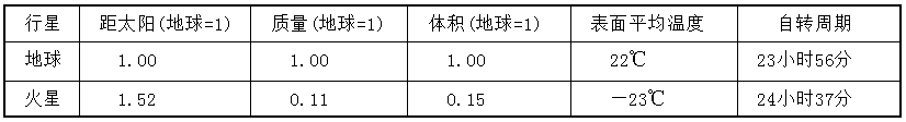 美国提出在2043年实现人类宇航员在火星生活一年的实验目标。下表为“地球与火星物理状态的比较表”,读表完成问题。地球与火星物理状态的比较表
