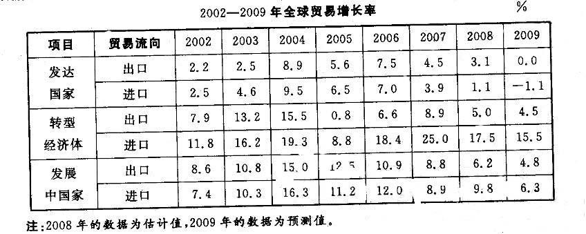 本題属于计算题。发展中国家2008年进口增长率为9. 8%,2007年为8. 9%.,增长了0.9个百分点。所以选择C选项。