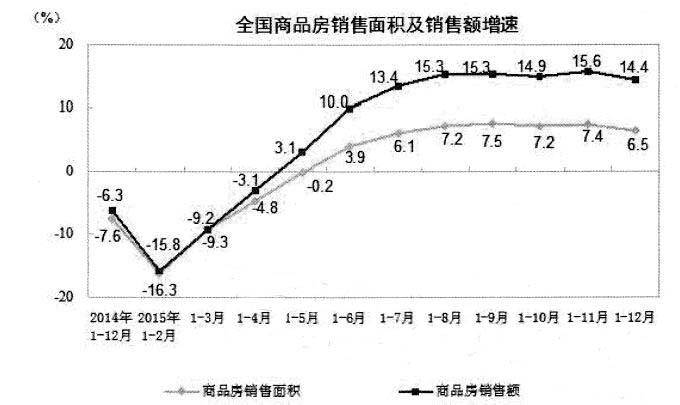 2015年,商品房销售面积128495万平方米,比上年增长6.5%,增速比1-11月份回落0.9个百分点。其中,住宅销售面积增长6.9%,办公楼销售面积增长16.2%,商业营业用房销售面积增长1.9%。商品房销售额87281亿元,增长14.4%,增速回落1.2个百分点。其中,住宅销售额增长16.6%,办公楼销售额增长26.9%,商业营业用房销售 额下降0.7%。