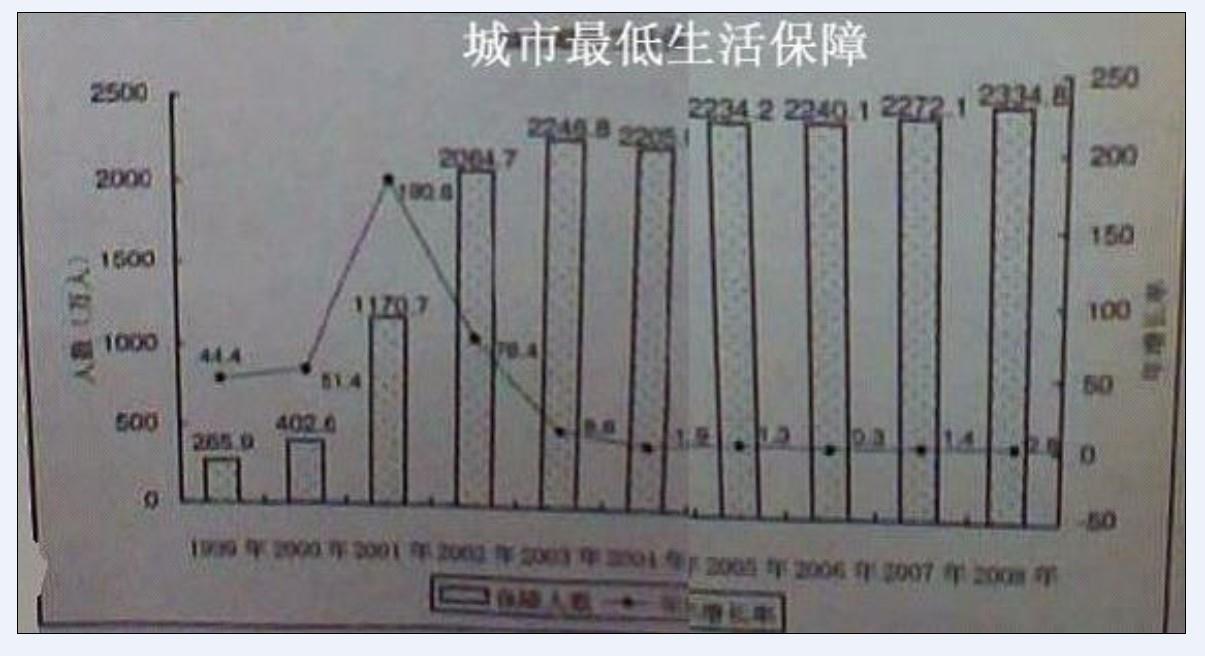 根据下列资料和图形,回答91~95题: 2008年各级财政共支出城市低保资金393.4亿元,比上年增长41.8%,保障了2330多万城镇贫困人口的基本生活。得到最低生活保障人员中:在职人员82.2万人,占总人数的3.5%,灵活就业人员381.7万人,占总人数的1.3%,老年人316.7万人,占总人数的13.6%,登记失业人员564.3万人,占总人数的24.3%,未登记失业人员402.2万人,占总人数的17.2%。在校生358.1万人,占总人数的15.3%,其他未成年人229.6万人,占总人数的9.8%。2008年农村最低生活保障制度在全国范围内普遍建立,农村低保正在应保尽保的目标迈进。全年共发放农村最低生活保障资金228.7亿元。比上年增长109.6%。 农村最低生活保障 城市最低生活保障