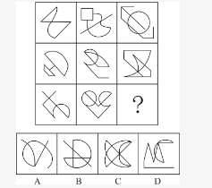 第一步,观察特征。组成元素不同,优先考虑属性类或数量类。线条特征明显,优先考虑数线。第二步,九宫格,优先考虑横向找规律。观察每一行的图形,发现无论是直线还是曲线的条数都没有规律。进一步观察发现,每个图形中均存在平行线,所以数图形中平行线的组数。第一行中的三个图形分别有1、2、3组平行线;第二行验证规律,符合;第三行中前两个图形的平行线组数分别为1、2,所以问号处的图形中平行线的组数应为3,只有D项符合。因此,选择D选项。