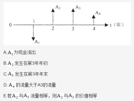 2007年建设工程经济真题第61题本题主要考查了现金流量图的绘制。现金流量图的作图方法和规则:(1)以横轴为时间轴,向右延伸表示时间的延续,轴上每一刻度表示一个时间单位,可取年、半年、季或月等;时间轴上的点称为时点,通常表示的是该时间单位末的时点;0表示时间序列的起点。(2)相对于时间坐标的垂直箭线代表不同时点的现金流量情况,现金流量的性质(流入或流出)是对特定的人而言的。对投资人而言,在横轴上方的箭线表示现金流入,即表示收益;在横轴下方的箭线表示现金流出,即表示费用。(3)在现金流量图中,箭线长短与现金流量数值大小本应成比例。但由于技术方案中各时点现金流量常常差额悬殊而无法成比例绘出,故在现金流量图绘制中,箭线长短只要能适当体现各时点现金流量数值的差异,并在各箭线上方(或下方)注明其现金流量的数值即可。(4)箭线与时间轴的交点即为现金流量发生的时点。综上所述,本题正确答案为ABC项。@##