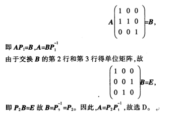 设A为3阶矩阵,将A的第2列加到第l列得矩阵曰,再将曰的第2行与第3行交换得A. P1p2 B.P-11 P2 C.P2P1 D.P2P一11