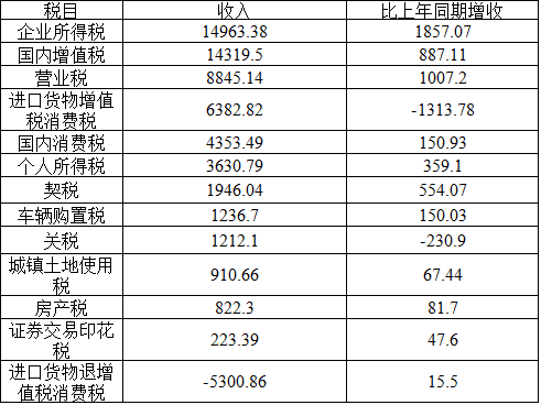 2015-广西-AA.2013年二季度,我国税收月收入同比增速逐步提高,分别为7.9%、8.3%、和12.9%。截至2013年6月,全国税收总收入完成59260.61亿元,同比增长7.9%,较上年同期回落1.9个百分点。其中,国内增值税、企业所得税同比分别增长6.6%和14.2%,较上年同期增速分别回落1.5和3.1个百分点;房产税同比分别增长11%,比上年同期增速回落19.1个百分点;进口货物增值税消费税和关税同比分别下降17.1%和16%,比上年同期增速分别回落24.5和22.9个百分点。2013年1-6月份全国主要税种收入表(单位:亿元)