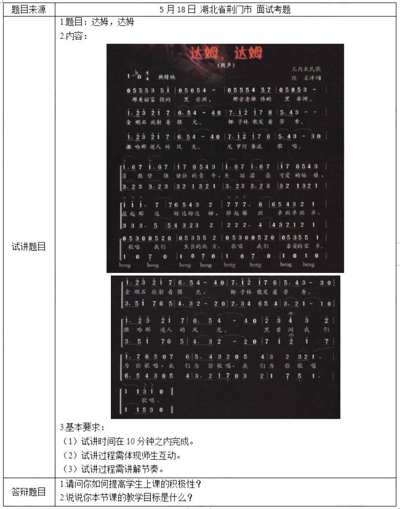 二、考题解析【教学过程】(一)导入新课1.教师出示图片,请学生来说一说乐器的种类和民族。(教师出示非洲鼓、姆比拉等乐器图)学生自由回答。2.教师总结并过渡:图片上的乐器分别是非洲鼓及非洲民间乐器姆比拉,是非洲代表乐器;今天我们就带着这两件乐器,探索非洲音乐的魅力。(二)感知歌曲1.初次聆听音乐,教师完整播放音乐,请学生说一说对于歌曲的“乐之初体验”。教师提出问题:谁来说一说歌曲给你的第一感觉是怎样的?学生自由回答。教师总结:歌曲非常富有节奏感,给人一种自由、热情、愉悦的感觉。2.再次聆听音乐,教师请学生边听边打基本拍,感受音乐的节奏特点,并初步了解非洲音乐特色。教师提出问题:谁来跟大家分享一下课下搜集的关于非洲音乐的资料。学生自由分享。教师总结:非洲音乐大多以鼓乐为主,节奏感十足,跟当地的气候一样,其音乐往往以欢快、热情的风格为主,传达着非洲人的热情与豪爽。(三)深入学习1.教师带领学生进行常规发声练习。2.教师弹奏钢琴,学生跟唱旋律。提出问题:谁能说一说歌曲可以分成几部分,每一部分给你什么样的感觉?学生自由回答。教师总结:根据演唱形式的不同,可以分成两部分,第一部分给人一种自由的感觉,第二部分给人一种热情、激动的感觉。3.教师播放音频,学生完整跟唱旋律。提出问题:歌曲有什么特点?能不能用自己的方式来表现一下音乐?学生自由回答及展示。教师总结并评价:歌曲中附点及切分节奏型一直贯穿始终,大家分别用打击节奏,拍手的方式展现自己听到的音乐及旋律,音乐感觉很棒。4.教师跟学生共同练习节奏型,并加入旋律演唱。教师在黑板上出示节奏型,并请学生左右打击基本拍,右手打击出示节奏型,给予学生5-8分钟的练习时间,之后带入旋律,边打边唱5.教师请学生代表朗诵歌词,感受歌曲的情感提问学生:歌词描述的是什么?分析出歌曲什么样的音乐情感?学生进行小组讨论,并自由回答。教师总结:歌曲通过对非洲沙漠、河流、植物以及人们的描绘,赞美自己的家乡,表达了非洲人民对于自己家乡的热爱与赞美,也体现了人们对于生活、大自然的热爱之情。6.教师请学生以词带谱,演唱歌曲,给予学生10分钟的时间以词带谱进行演唱,完整演唱歌曲。7.边打节奏,完整演唱歌曲。(四)巩固提升1.教师请学生以小组为单位,用自己的方式表现歌曲。之后,请学生进行展示。2.并针对学生的表现,组织自评及他评。(五)课堂小结教师以提问的方式总结本节课的内容及知识,总结非洲音乐中及节奏感较强等特点,也给予学生热爱生活以及自然的美好希望,呼吁大家积极面对生活,学会发现生活中的美。作业:请学生搜集关于“非洲音乐”的作品,下节课进行分享。【板书设计】[img]/upload/tiku/397/10752616_1.png[/img]【答辩题目解析】1.请问你如何提高学生上课的积极性?【参考答案】培养学生学习兴趣,调动学生学习积极性是提高教学质量的关键。学生是教学的主体,是课堂教学中的主角,所以提高学生的课堂积极性就成为了我们教学活动的重要工作。首先,要对学生进行注意力的培养。能够在上课的初始,就提高学生对于本节课知识点的注意,是上一节好课的重点。其次,手段的多样化。要从学生的兴趣爱好点入手,通过不同的教学手段和教学方法去吸引学生提起对知识点的注意。第三,影响与激励。课堂上教师应该对学生多加鼓励和引导,从自身做起,严于律己,为人师表,通过自身的行动力来激励学生们积极地投入到学习中去。最终,总结以上的几点方式方法,我认为,上好一节课的关键,不仅在于教师的教,同时还有学生的学,所以培养学生的课堂积极性,也是非常重要的工作。2.说说你本节课的教学目标是什么?【参考答案】情感态度价值观:通过歌曲的学习,感受非洲音乐的不同韵味,体会不同民族的音乐风格,理解音乐文化多样性。过程与方法:通过欣赏、对比及小组讨论的方式,学生能够了解不同非洲音乐的魅力,感受非洲音乐风格。知识与技能:了解非洲音乐的不同风格,能够正确配合音乐打击出相应的节奏型,并能够说出歌曲表达的音乐情感,且能演唱歌曲旋律。