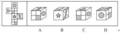 左边给定的是纸盒外表面的展开图,右边哪一项能由它折叠而成?请把它找出来