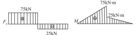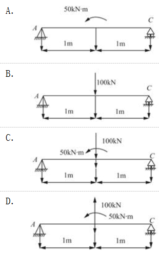 弯矩图在中间处突变,则构件中间有集中力偶大小为50kN·m;剪力图中间有突变,则说明构件中间有集中力,大小为100kN。根据中间截面处的左右两侧剪力(瞬时针为正)与集中荷载的平衡,则集中荷载竖直向下,C项正确。