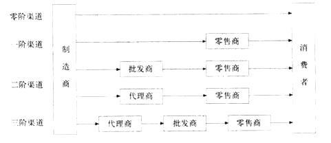 分销渠道是指分销渠道是指某种商品和劳务从生产者向顾客移动过程中,取得这种商品和劳务的所有权或帮助所有权转移的所有企业和个人。根据渠道层次数目划分,分销渠道可分为:零阶渠道、一阶渠道、二阶渠道、三阶渠道,如图所示。