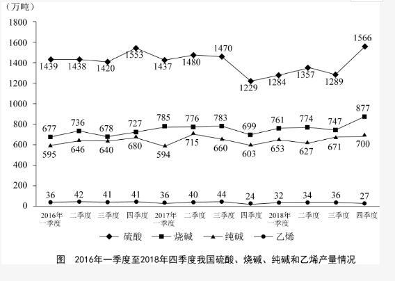 2018年我国硫酸、烧碱、纯碱和乙烯产量分别为5496万吨、3159万吨、2651万吨和129万吨。2016年一季度至2018年四季度我国硫酸、烧碱、纯碱和乙烯产量见下图。