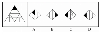 本题考查空间重构。利用坐标法,由于四个选项中都有黑三角的面,因此以黑三角的面作为坐标,画一个向上的箭头,可以发现:黑三角下边是含有一条线的面、右边是含有“T”型线的面、左边是含有“+”型线的面。在四个选项的黑三角面上画同样的箭头,可见,只有D符合。因此,选择D。