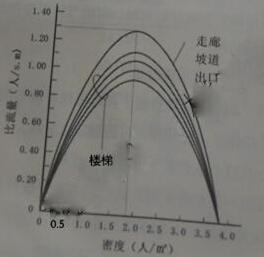 技术实务544页。比流量反应了单位宽度的通行能力。也就是比流量越大疏散时间越短。由图显示,对于出口来讲比流量最大时为1.3人/s m,经计算最短时间为76s,约等 于80s。