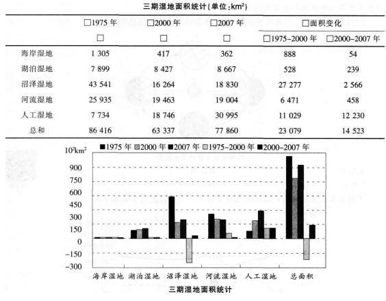 下图为1975年、2000年和2007年我国东北地区湿地面积统计图,读图回答第题。