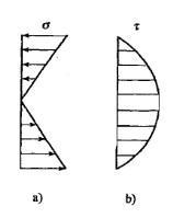 提示:矩形截面梁横力弯曲时,横截面上的正应力σ沿截面高度线性分布,如解图a)所示。在上下边缘σ最大,在中性轴上正应力为零。横截面上的剪应力τ沿截面高度呈抛物线分布,如解图b)所示。在上下边缘τ为零,在中性轴处剪应力最大。