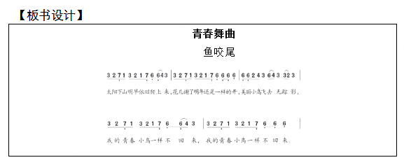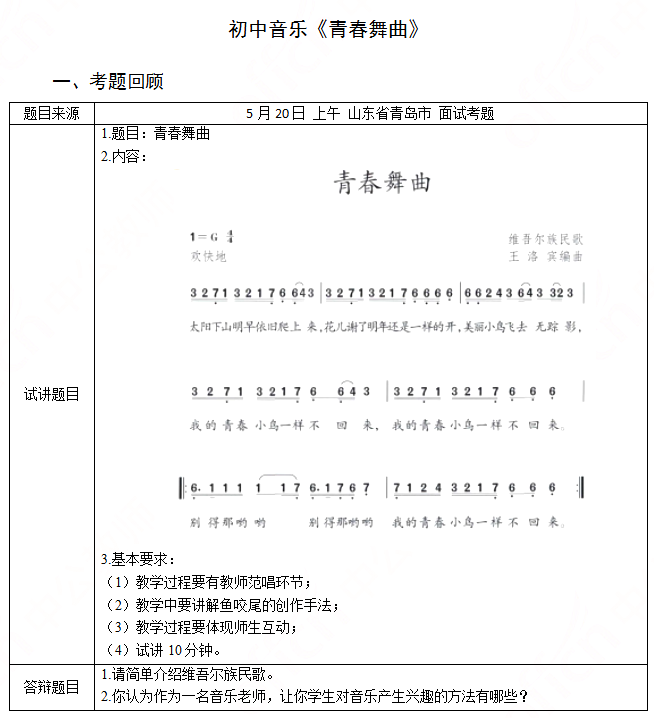 二、考题解析【教学过程】(一)情景导入1.老师播放具有浓郁的新疆民族特色的图片和视频片段,来进行导入。老师设置问题:同学们猜一猜这些内容都是表现我国哪个少数民族的特色的?学生自由回答。2.老师归纳总结:新疆维吾尔族是我国的少数民族之一,位于我国新疆地区,这个民族的人民能歌善舞,有自己独特的民族服饰和舞蹈特色,今天我们就来学习一首和这个少数民族有关的歌曲,它是用来告诉大家要珍惜时间、珍惜生活的,这首的名字叫做——《青春舞曲》。(二)初步感知1.欣赏歌曲(1)老师设置问题:歌曲分几个部分?分别是什么内容?学生讨论回答。(2)以小组的形式回答刚才老师提出的问题,并说明划分的理由。2.介绍歌曲相关知识(1)介绍“鱼咬尾”的创作手法,并展示相关的谱例。①引导学生先根据字面意思,理解创作手法的特征;②再根据相关谱例,找出乐谱的写作特点,并尝试自由根据“鱼咬尾”的创作手法进行旋律编创。(2)了解重复的写作手法。并以小组的形式讨论和思考,还有哪些大家熟悉的乐曲是采用了重复和“鱼咬尾”的旋律发展手法进行创作的。(三)探究学习3.学唱歌曲(1)学生先在教师的电子琴伴奏中视唱旋律。(2)学生跟随视频音乐哼唱旋律(老师引导学生一边哼唱,一边用手拍击节奏)。(3)难点突破,注意情绪和节拍的准确掌握,要演唱出活泼、欢快的乐曲风格。老师设置问题:你们认为哪个地方不太好唱?学生讨论回答(4)播放音乐视频,学生体会旋律的旋律特点,采用通俗音乐的创作手法。(5)老师将难点范唱,学生模唱。(6)学生随视频齐唱歌曲(加深情感体验)(四)拓展延伸1.观看相关的舞蹈视频,学习具有浓郁特色的维吾尔族舞蹈动作。2.以小组的形式进行舞蹈创编,并能够为歌曲进行伴舞。3.小组分别进行舞蹈展示,其他同学进行歌曲演唱,教师并对各个小组的表演做出评价。(五)小结作业通过本节课的学习,同学们已经初步了解了旋律的创作手法——鱼咬尾、重复,并且能完整的有感情的演唱歌曲。课下请同学们搜集其他劝勉人们珍惜时间的歌曲,下节课可以与其他同学进行分享。