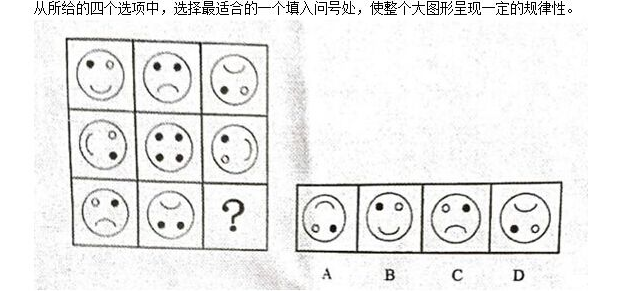 A. 如上图所示 B. 如上图所示 C. 如上图所示 D. 如上图所示A九宫格中,处于四个顶角位置的图形,嘴巴翻转,眼睛颜色互换。