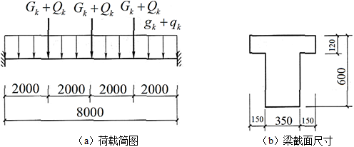 某民用建筑普通房屋中的钢筋混凝土T形截面独立梁,安全等级为二级,荷载简图及截面尺