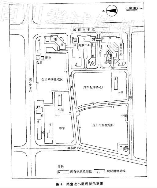 某城市小区,三面临城市干道,其南侧为支路。总用地为14.5hm2。现状市政管线已埋入道路地下,已建配电房能满足小区改建后要求。该小区用地东侧已建成金融、商业服务中心;小区西北角有2幢新建住宅褛和1所中学;另有2所小学、1处托儿所以及2片危旧平房住宅区和1处汽车配件铸造厂(如图4所示)。现已决定将此小区列为危改居住小区进行统一规划。试根据现状条件及一般危改居住小区的规划设计要求,提出需要调整和增加的主要内容。