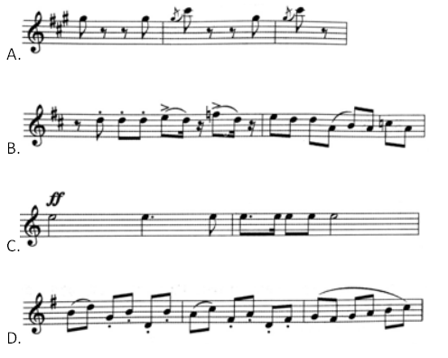 D选项,小步舞曲的节奏特征为三拍子,综上,D选项正确。 A选项,是二拍子。故排除。 B选项,是四拍子。故排除。 C选项,是四拍子。故排除。 故正确答案是D选项。