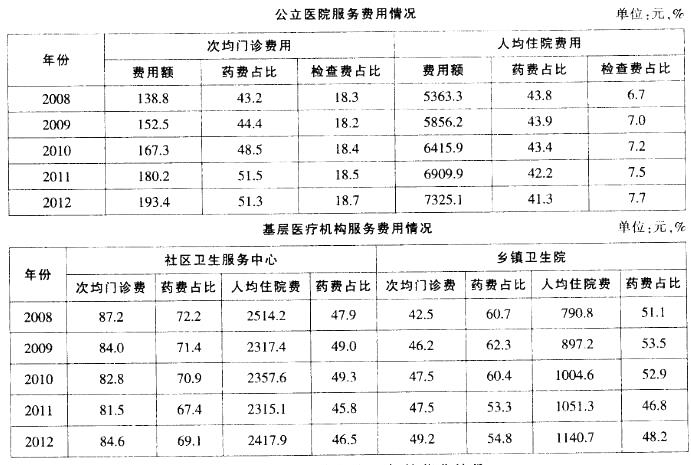 A项,比较表格1第二、四列数据,2010~2012年公立医院次均门诊费用和检查费占比都高于上年,故这二年检查费均高于上年,而2009年次均门诊费用总额与2008年相比增长超过5%、检査费占比与2008年相比下降不到1%,则2009年检查费大于2008年,正确;B项,由表格1倒数--、=列可知,2008~2012年公立医院人均住院费用和检查费占比均逐年上升,故检查费也逐年上升,正确;C项,由表格2第二行可知,2008年社区卫生服务中心的人均住院费是乡镇卫生院的2514.2÷790.8≈2500÷800=3.x倍,正确。可直接选择D。验证D项:由表格2第四、五列可知,2011年社区卫生服务中心人均住院费及药费占比均最小,故药费也最少,为2315.1x45.8%;2008年、2010年药费分别大于2012年、2009年;2008年与2010年相比,2010年人均住院费比2008年下降超过5%、药费占比增长不到5%,故2008年药费最多。所求费用之差为2514.2x47.9%-2315.1x45.8%=2514.2x(45.8%+2.1%)-2315.1x45.8%>2500x2%+180x40%=50+72>100,D错误。