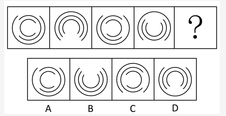 本题考点为图形推理中的位置类-旋转,观察图中图形,发现内环每次顺时针旋转90°,中间环逆时针旋转90°,外环顺时针旋转180°故旋转以后应该内环开口朝右,中间环开口朝左,外环开口朝上,只有A项符合。故正确答案为A。