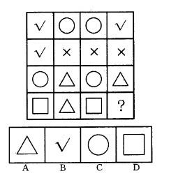 B①阴影与空白变化:相同变空白,不同为阴影;②图形叠加优先保留顺序:口>Δ>〇,据此两条规律,将每行的第一图与第二图叠加形成第三图。
