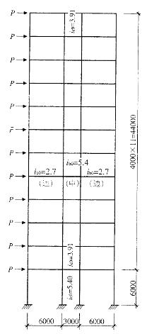 假定,P=10kN,底层柱顶侧移值为2.8mm,且上部楼层各边梁、柱及中梁、柱的修正系数分别为a边=0.56,a中=0.76。试问,不考虑柱子的轴向变形影响时,该榀框架的顶层柱顶侧移值(mm),与下列何项数值最为接近?(A)9(B)11(C)13(D)15