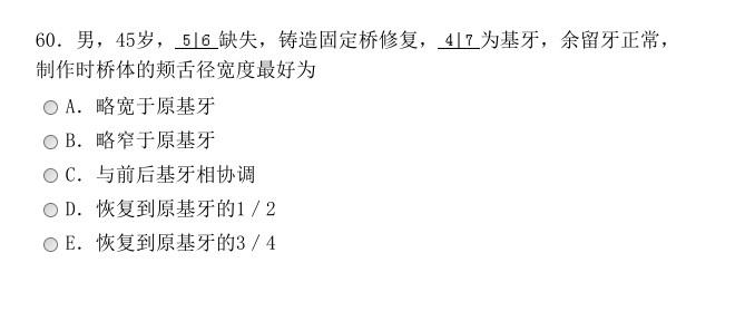 为基牙,余留牙正常,制作时桥体的颊舌径宽度最好为A.略宽于原基牙B.略窄于原基牙C.与前后基牙相协调D.恢复到原基牙的1/2E.恢复到原基牙的3/4