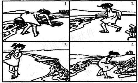 先是图2中的“过河无挢”,,然后是困4中的“寻找未板”,接着是困1中的“搭木板作桥”,最后是图3中的“到达对岸”,故选B。