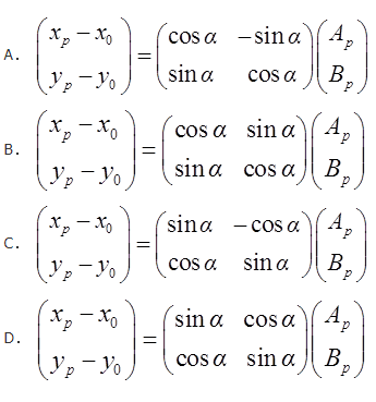 设A、B坐标系为施工坐标系,A轴在测量坐标系中的方位角为α,施工坐标系的原点为O′,其坐标为x0和y0,下列何项表达了点p的施工坐标Ap、Bp转换为测量坐标xp、yp的公式( )。