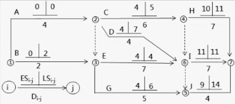 某工程双代号网络计划如下图,已标出各项工作的最早开始时间(ESi-j)、最迟开始时间(LSi-j)和持续时间(Di-j)。2018真题该网络计划表明()。...