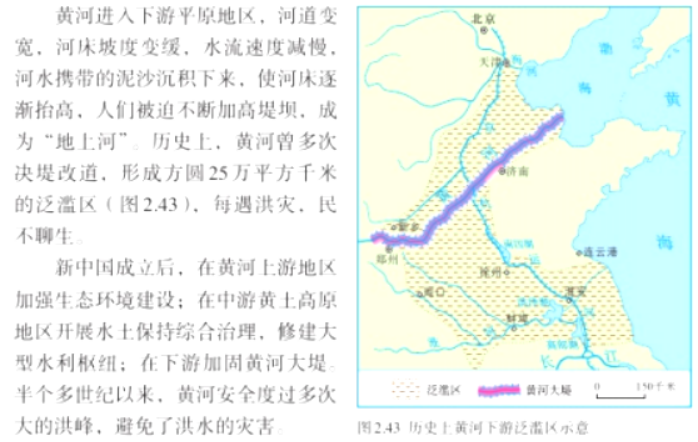 黄河进入下游平原地区,河道变宽,河床坡度变缓,水流速度减慢,河水携带的泥沙沉积下来,使河床逐渐抬高,人们被迫不断加高堤坝,成为“地上河”。历史上,黄河曾多次决堤改道,形成方圆25万平方千米的泛滥区(图2.43),每遇洪灾,民不聊生。新中国成立后,在黄河上游地区加强生态环境建设;在中游黄土高原地区开展水土保持综合治理,修建大型水利枢纽;在下游加固黄河大堤。半个多世纪以来,黄河安全度过多次大的洪峰,避免了洪水的灾害。3.基本要求:(1)试讲时间控制在10分钟以内。(2)教学中要体现学生的主体地位。(3)讲清楚黄河的忧患和治理措施。(4)配合教学内容要有适当的板书设计。答辩题目1.请简单介绍黄河出现的凌汛和地上河现象。2.你认为地理教学中展示相关视频的作用有哪些?