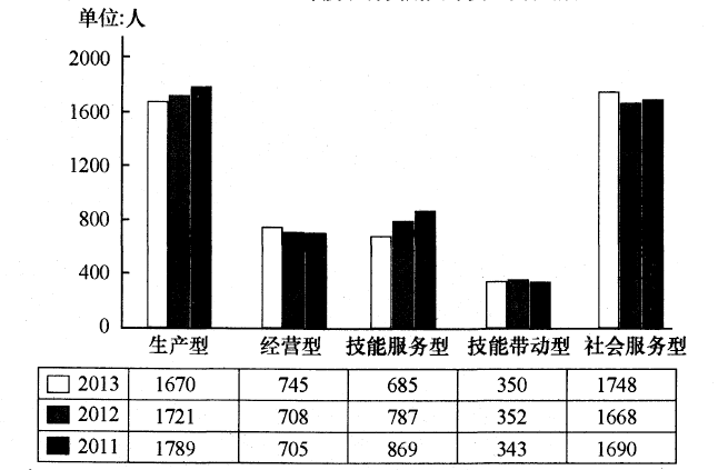 2013年某市A区现有镇级单位10个,村民委员会124个,村民小组2325个。截止到2013年底,全区农村实用人才总数5198人,与去年的5236人相比基本保持平稳,同比减少0.7%,降幅缩小了2.3个百分点。在农村实用人才总量中,行政村拥有人才4870人,占总量的93.7% ;女性人才934人,占 比较上年提高3.7个百分点,达到18.0% ;中共党员占比继续下降1.8个百分点至28.1 %。五类人才中,社会服务型和生产型人才是本区农村实用人才的主体,共同占到了人才总数的六成以上。经营型和技能服务型人才其次,技能带动型人才最少(详见图)。随着农业生产规模化程度不断提高,生产型和技能服务型人才数量稳步提升;而技能带动性、经营性以及社会服务型人才存在小幅波动,人才结构正在不断优化。