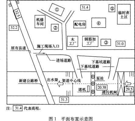 【背景资料】某泵站枢纽工程由泵站、清污机闸、进水渠、出水渠、公路桥等组成,施工现场地面高程为31.0~31.4m,泵站底板建基面高程为20.38m,钻探资料表明,地基18.5~31.4m高程范围内为黏土,12.0~18.5m高程范围内为中砂,该砂层地下水具有承压性,承压水位为29.5m。承包人在施工进水方案中提出,基坑开挖时需要采取降水措施,降水方案有管井降水和轻型井点降水两个方案。根据施工需要,本工程主要采用泵送混凝土施工,现场布置有混凝土拌合系统、钢筋加工厂、木工厂,预制构件厂、油料库等临时设施,其平面布置示意图如图1所示。