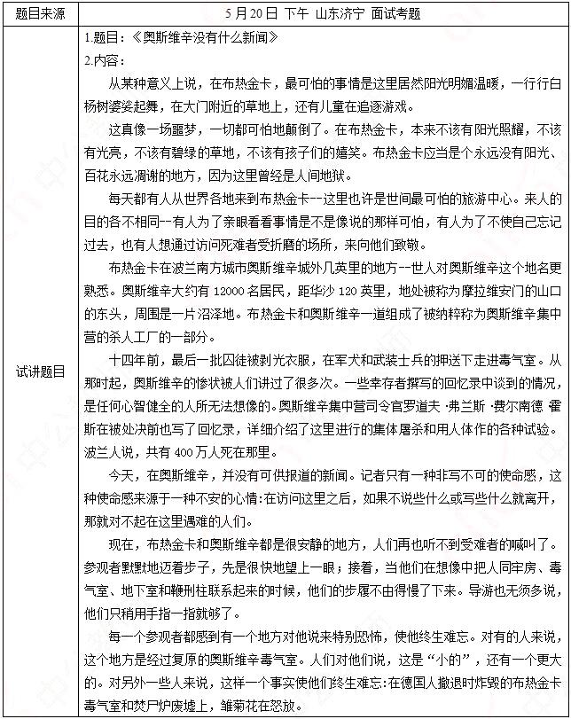 1、我在这篇课文的教学时着重引导学生通过对文本的学习了解历史,学会侧面描写,但在课堂上可能有学生对于二战的历史知识过于陌生,理解文本存在着一定的困难,所以应该在课前或者课上进行一定的背景补充。语文课堂应达到人文性与实践性的统一,课堂上并没有设置学生去练习侧面描写,可以在课后的作业有所涉及。以上是我全部的答案,谢谢考官。2、新闻作品的第一原则就是真实,所有的新闻作品都不应例外,今天学习的这篇课文也满足这一原则。真实性主要体现在以下几个方面。首先,客观事实的真实。是指在报道上内容的真实,二战期间奥斯维辛集中营发生的大屠杀是确定无疑的客观事实,这一层是历史上的真实。题目来源于考生回忆其次,作者并没有直接去描写奥斯维辛集中营的恐怖,而是通过参观者侧面的展现奥斯维辛的恐怖,作者刻画的参观者的感受也是真实性的一方体现。综合以上的内容可知这篇新闻作品的真实性体现在两个方面,一是史实的真实性,一是作者刻画参观者情感的真实。以上是我全部的答案,谢谢考官。