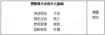引导学生从“战争”中得出一些词语:恐惧、绝望、死亡……(二)初读课文,掌握顺序1.通读全文,找出本篇新闻作品的标题、导语、背景、主体、结尾,并说说每部分都写了什么。明确:导语(1-3)讲述现在,背景(4-5)回忆过去,主体(6-15)参观苦难,结尾(16)回到现在。2.根据大家划分出的部分,我们不难发现,主体(6-15)参观苦难,是文章的主体部分也是体现作者情感的部分,那么参观的顺序是怎样的呢?明确:按照空间顺序,毒气室—焚尸炉—女牢房—不育试验室—纪念墙—绞刑室。3.参观者脚下的奥斯维辛集中营给你一种怎样的感受呢?明确:恐怖。题目来源于考生回忆(三)抓住重点,体会情感1.引导学生划出参观者在参观不同地点时的动作和表情。明确:毒气室、焚尸炉——“开头,他们表情茫然,因为他们不晓得这是干什么使的。”“他们不由自主地停下脚步,浑身发抖”。女牢房——“一个参观者惊惧万分,张大了嘴巴,他想叫,但是叫不出来”。绞刑室——“感到自己也在被窒息”“另一位参观者进来了,她跪了下来,在自己胸前画十字”“参观者用恳求的目光彼此看了一眼”。2.开展小组合作探究:通过我们刚刚找到的那些句子我们可以从中体会到参观者怎样的心理状态?想想作者为什么没有直接去描写这些地点,而是通过参观者来表现集中营恐怖的。题目来源于考生回忆明确:(1)参观者无不惊恐万分。(2)运用侧面描写,从侧面烘托这种恐怖的气氛,比直接去描写给读者的冲击力更大,读者便不由自主的进入了参观者的情境。3.回到开头的部分,作者连用四个“不该”,读一读并体会其中的含义有哪些。明确:将奥斯维辛现在的美好与奥斯维辛过去的痛苦相联系,用“不该”二字进行连接形成鲜明的对比,历史上的奥斯维辛与现在的奥斯维辛反差越大,就越让人无法接受,也暗示着读者不要忘记那个伤痛。(四)拓展延伸,小结作业1.学过本课,谈谈自己对于战争的理解。2.观看与二战相关的影片,如《辛德勒的名单》《钢琴师》,写一篇300字左右的影评。【板书设计】