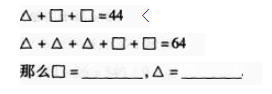 17 10 [解析]由题干知△+2□=44(1)3△+2口=64(2),(2)-(1)得2A=20,则A=10,从而2口=44-10,解得口=17.