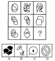 每一行分别由一个纯直线图形、一个纯曲线图形和一个直曲结合的用形构成,问号处应选一个直曲结合的图形。故选D。