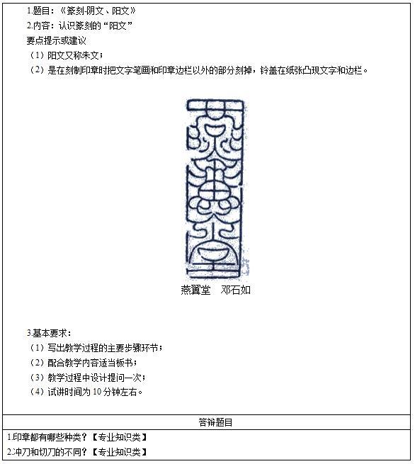 高中美术《篆刻-阴文、阳文》 主要教学过程及板书设计教学过程活动一:谈话讨论,导入新课教师讲授玺印的故事。引导学生聆听,并引出课题——《篆刻》。活动二:赏析印章,思考探究(一)欣赏感知教师展示作品,并引导学生分析两幅篆刻作品的异同点?教师总结:篆刻分为阴文与阳文(二)形式分析1.教师展示“燕翼堂”印章图片,并提问属于阴文、阳文中的哪一种?学生思考并回答。教师资格证面试真题教师总结并讲解:阳文:就是在刻制印章时把文字笔画及印章边栏以外的部分刻掉,鈐盖在纸上凸现文字和边栏。阴文:将印文周围部分刻除,印文突出,简单地说就是刻制印章时把文字的笔画刻掉,鈐盖在纸上的文字部分是白的;2.继续展示作品燕翼堂,并提出问题:作品中字体有什么特点?(小组讨论)学生交流探讨,教师总结:线条简洁、爽利;布局疏密有致,气脉相通活动三:比较鉴赏,拓展提高教师展示印章图片,学生找出属于阳刻的篆刻作品。比一比,哪一组找的得最快,哪一组画得最有特色。并让其他同学来评价正误,老师并进行总评,点评时注意从本节课的重难点出发。活动四:小结作业总结:篆刻的分类并回顾起概念。作业:课后动手尝试一下制作印章。板书设计[img]/upload/tiku/397/8711649_1.jpg[/img]答辩题目解析1.印章都有哪些种类?【专业知识】【参考答案】(1)封泥:古人将文字书写在竹木片上,再将这些竹木片编联在一起,写好的公文或书信用绳子栓好,为了保密,在绳子结上加一块轻泥,再在泥面上盖印,泥面上出现凹凸的字,人们把这种盖有印的泥称为“封泥”。(2)秦汉印:秦汉时期,由于国家统一,经济昌盛,印章空前发展起来,多以小篆、缪篆入印,达到了印章艺术历史的高峰,这时期的印章称为“秦汉印”。(3)官印:此种印区别于私印,印面多用“印”、“章”等文字,多为年俸禄两百石以上的高官所用,汉代流行。(4)私印:区别于官印的私人用印,印面多为“信印”、“私印”字样,以汉代最为流行。(5)肖形印:以图像入印的印章。(7)闲章:从隋唐时期的“闲印”开始,唐太宗有以年号为印文的联珠印“贞观”,印章转入游艺性质并作为艺术作品的补充后,这类印章称为“闲章”。2.冲刀和切刀的不同?【专业知识】【参考答案】(1)冲刀:用刀角顺着要刻的线条推力向前,并用无名指紧抵石章边缘,以控制运行速度。冲刀角度小,与平面约成30度。冲刀的特点是出锋锐利,印文挺拔刚健,适宜镌刻平方正直较规矩的印文。(2)切刀:执刀角度比冲刀大,约成60度,切刀所切线条较短,依靠刀角一起一伏,将要刻部分镌刻。