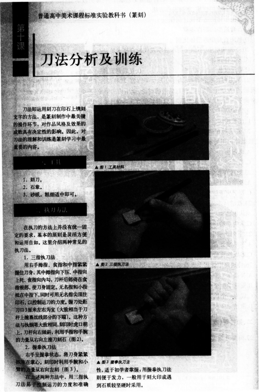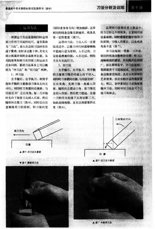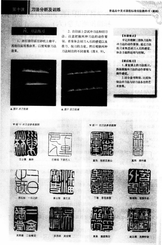 【课题】刀法分析及训练【课时】1课时【课型】新授课【教学目标】知识与技能:1.学生能够了解三指执刀法和握拳执刀法的操作感觉,了解冲刀法和切刀法各自的艺术效果。2.掌握三指执刀法和冲刀法的基本动作要领,可以运用基本刀法设计制作一枚印章。过程与方法:通过刀法练习来熟悉刻刀入石的感觉,体会力量的运用与控制。情感、态度与价值观:通过课堂刀法练习和制作印章练习,激发学习篆刻的兴趣,受到篆刻美的陶冶,增强民族自豪感。【教学重点】能够掌握三指执刀的冲刀法的基本动作要领,独立制作一枚印章。【教学难点】能够运用学过的刀法制作出有富有艺术特色的印章。【教学准备】各朝代各流派名家的印章课件。冲刀法运刀和切刀法的演示视频,应用冲刀法制作的印章图例和应用切刀法制作的印章图例。刻好的冲刀法和切刀法印章两枚。刻刀、印石、印泥、砂纸、毛笔、墨汁、宣纸、牙刷等。【教学过程】环节一:组织教学.导人新课教师组织好课堂秩序,开始播放各朝代各流派名家的印章课件。(设计意图:营造立体教学氛围,有利于学生迅速、积极地进入课堂)环节二:讲授新知识(一)讲解冲刀法和切刀法的艺术效果。展示应用冲刀法制作的印章图例和应用切刀法制作的印章图例。提问:这两种图例的印章有什么不同点 教师总结:冲刀法刻出来的线条边缘爽洁完整,给人以流畅挺拔的感觉,切刀法刻出的线条边缘参差钝涩,具有古朴浑厚的艺术效果。(二)讲解冲刀法和切刀法的操作要领。播放冲刀法和切刀法的演示视频。提问:冲刀法和切刀法各有什么操作要领 有什么不同点 教师边重复播放演示视频边总结:操作要领:冲刀法是利用手指和手腕的力量推动刀锋从右向左冲行。刻印时刀身需向右倾斜,与印面呈30度夹角。切刀法是用手腕的力量将刀锋在印面上向下切入,刻印时刀身稍向右倾,与印面呈60度左右夹角,先将刀锋一角插入印面,随即向左摆刀身,使刀锋完全切入印面,然后把刀提起,在前一刀的尽头处接下去再切第二刀。不同点:冲刀法每刻一笔都一刀冲成,切刀法每刻一笔则需要若干刀连接而成。(三)现场演示冲刀法和切刀法的运刀方法。1.教师拿出刻刀、印石等治印工具,先给大家介绍一下三指执刀法和握拳执刀法。学生分别感受一下两种执刀方法的感觉。2.教师用三指执刀法分别演示冲刀法和切刀法。学生用三指执刀简单练习两种刀法。在练习期间老师巡视指导。(设计意图:通过教师播放篆刻的视频激发学生兴趣,通过教师对于刀法的规范性操作步骤,学生能够更加直观的感受篆刻的精妙之处.对于知识的掌握更牢固)环节三:巩固练习、创作实践学生制作。教师辅导让学生拿出上节课设计好的篆刻图案。要求学生用三指执刀运用冲刀法制作印章.并指出在制作过程中的注意事项:1.安全。2.卫生。3.操作中的注意事项:(1)注意侧锋用刀的原则,即刀锋向里稍加倾斜,这样刻出的线条边缘呈斜坡状,线条具有一定的宽度。(2)刀尖入石一定要深浅适中,以推刀冲行时能够顺畅平稳地行进为原则。入石过浅,刀尖容易滑离印面,入石过深,则阻力太大无法行刀。(设计意图:巩固新知,加强理解,师生共同发现问题所在)环节四:作品展示与评价.教师小结1.分小组互评作品,每个小组选出最好的作品展示,教师鼓励其他学生积极发表自己的看法和建议。最后教师小结。评价学生作业要点:图稿的设计是否有独特之处 刀法的运用是否能达到预期 你最喜欢哪枚印章 为什么 2.教师总结本节课重点,引导学生感受篆刻美,增强民族自豪感,热爱中国传统文化。3.布置课后作业:重复课上的刀法练习,结合参考附图,比较和领会冲刀法与切刀法各自的艺术效果。(设计意图:充分展示自我,学生能够明白自己的问题找到发展方向,提高语言表达能力)【板书设计】[img]/upload/tiku/442/5423051_1.png[/img]【教学反思】()