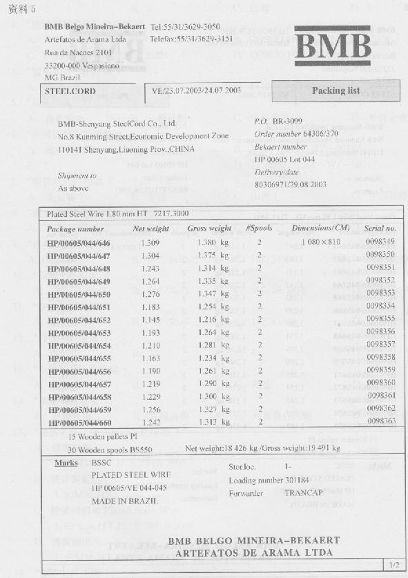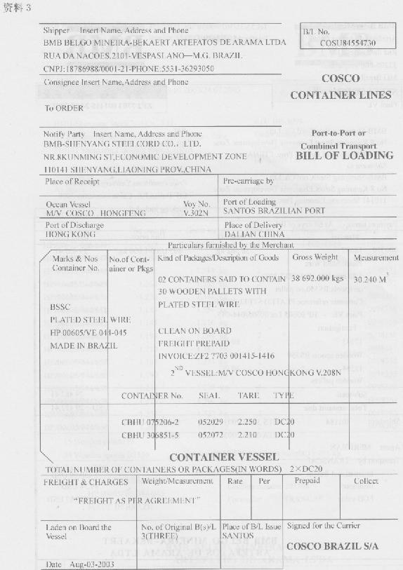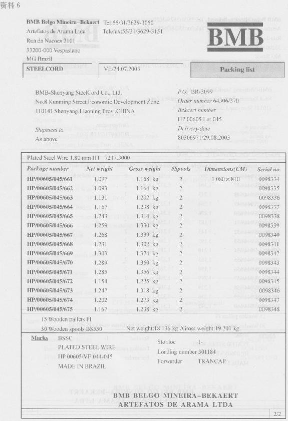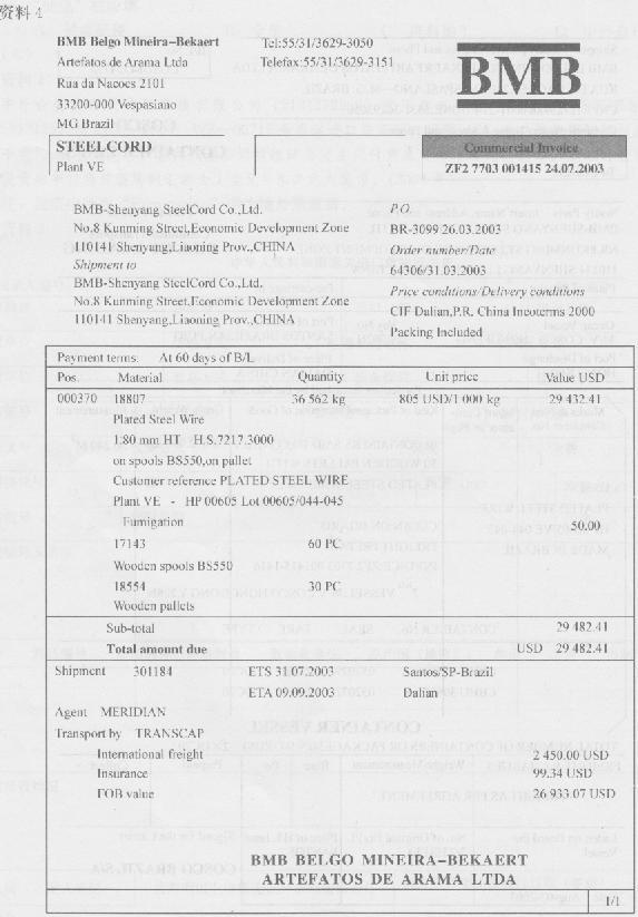 (六)资料1中外合资沈阳贝沈钢帘线有限公司 (2101232999)使用自有资金, 委托上海新元五矿贸易公司(3105913429)持2100—2003 wZ—O0717号自动进口许可证(代码:7)进口镀黄铜钢丝(法定计量单位为千克).货物到港后,报关代理公司报检时为货主代付熏蒸费等410元人民币.舱单件数同装箱单件数.设货物申报当日适用的汇率为1美元=8.2元人民币.(2004年)注:发票中所列“Fumigation”项为境外熏蒸费.
