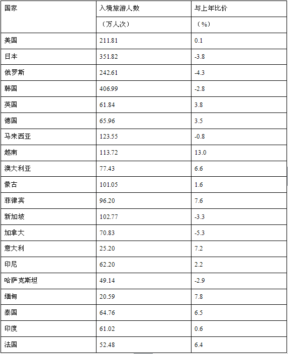 2012年,全国国内旅游人数29.57亿人次,比上年增长12.0%。其中,城镇居民19.33亿人次。2012年,全国国内旅游收入22706.22亿元人民币,比上年增长17.6%。2012年,全年入境外国游客人数比上年增长0.3%,其中,亚洲市场入境人数1664.88万人次,与上年基本持平,占入境外国游客人数61.2%;欧洲市场入境人数592.16万人次,增长0.2%;美洲市场入境人数317.95万人次,减少0.7%;大洋洲市场入境人数91.49万人次,增长6.5%;非洲市场入境人数52.49万人次,增长7.4%。