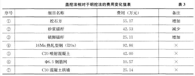 事件3:施工单位对盖挖法方案相对于明挖法方案的部分施工费用进行了核算和对比,见表3。其中,挖石方费用增加了55.17万元,砂浆锚杆费用减少了42.53万元,φ42锁脚锚杆费用增加了25.11万元。