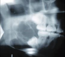女,32岁,右下后牙龈向外膨隆,后牙渐松动3个月。X线片(如图)示右下颌磨牙区颌