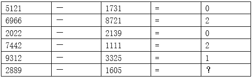 第一步,观察图形特征。组成元素不同,优先考虑数量类或者属性类。第二步,所给图形为6×5宫格,横向规律较为常见,优先考虑。所有图形的逻辑关系均为数字相减,可以考虑数字中封闭空间的个数,观察发现:第一行中两组数字均无封闭空间,因此相减数字为0,第二行中封闭空间数量为4-2=2,第三行中封闭空间数量为1-1=0,第四行中封闭空间数量为2-0=2,第五行中封闭空间数量1-0=1,因此符合封闭空间数量相减规律。第五行中封闭空间数量为5-2=?,因此问号处为3。因此,选择C选项。