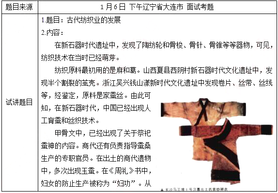二、考题解析【教学过程】环节一:导入新课教师出示马王堆1号汉墓出土的素纱禅衣的图片,并介绍:大家可以看到这件汉代的丝织衣物做工精良,衣长128厘米,袖长190厘米,重量仅仅只有49克,薄如蝉翼。而且它在墓室中一千多年,还能保持完好,由此可知我国古代纺织业的高超技艺。这节课就让我们一起走进中国古代的纺织业,了解它的光辉历程。环节二:新课讲授(一)先秦时期过渡:中国纺织业的历史非常悠久,早在新石器时代。中国的纺织业就开始萌芽,在诸多新石器时代的遗址中发现了陶纺轮和骨梭、骨针、骨锥等纺织工具。教师讲解并提问:在山西的新石器文化遗址中发现了茧壳,而在浙江的新石器文化遗址中则发现了家蚕丝,这些现象说明了什么呢?学生回答早在新石器时代,我国很多地区的人已经学会养蚕,并且会用蚕丝纺织了。教师讲解:到了商周时期,伴随着社会的进步,纺织业也不断的进步,出现了负责指导蚕桑生产的专职官员,到了周朝,纺织工匠成为当时社会的六大职业之一,这些说明了什么问题。学生回答后教师总结,说明了纺织业在当时社会地位十分重要。(二)汉唐时期教师提问:汉朝和唐朝是我国经济繁荣时期,在这两个强大的王朝,纺织业的发展状况如何呢?请同学们以历史小组为单位,5分钟时间讨论。学生思考回答后教师总结:汉代的素纱禅衣充分体现了当时纺织业的高超制作工艺,当时纺织品的花色多种多样,丝织品远销地中海地区,中国也因此被称为“丝国”。唐代的官营纺织业规模很大,与此同时私营纺织业也开始兴起。(三)宋明时期宋朝和明朝的纺织业在汉唐基础上进一步获得了发展,宋明时期,我国古代的纺织业又有了哪些新特点呢?请同学们相互交流回答。学生思考回答后教师归纳总结:宋代棉纺织技术得到推广,明代出现了雇工和自由劳动市场。环节三:小结作业1.小结:师生共同总结回顾本课所学知识。2.作业:找一找我国古代著名的丝织品,下节课分享。【板书设计】