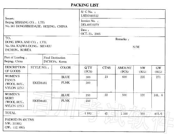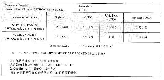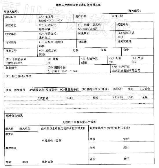 北京思尚服装有限公司(110641XXXX)委托北京隆昌货运有限公司(110253 XXXX)出口一批来料加工货物。该批货物于2005年11月12曰从天津新港经“QUEEN/1583F”船舶运往韩国。
