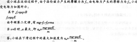 题目:如图所示,空间有水平向右的匀强电场E与垂直纸面向外的匀强磁场B。竖直固定的绝缘长杆上套有一个带正电的小球,带电量为q、质量为m,小球和杆间的动摩擦因数为μ,且mg>μqE。现使小球由静止释放,求小球在下滑过程中的最大加速度。